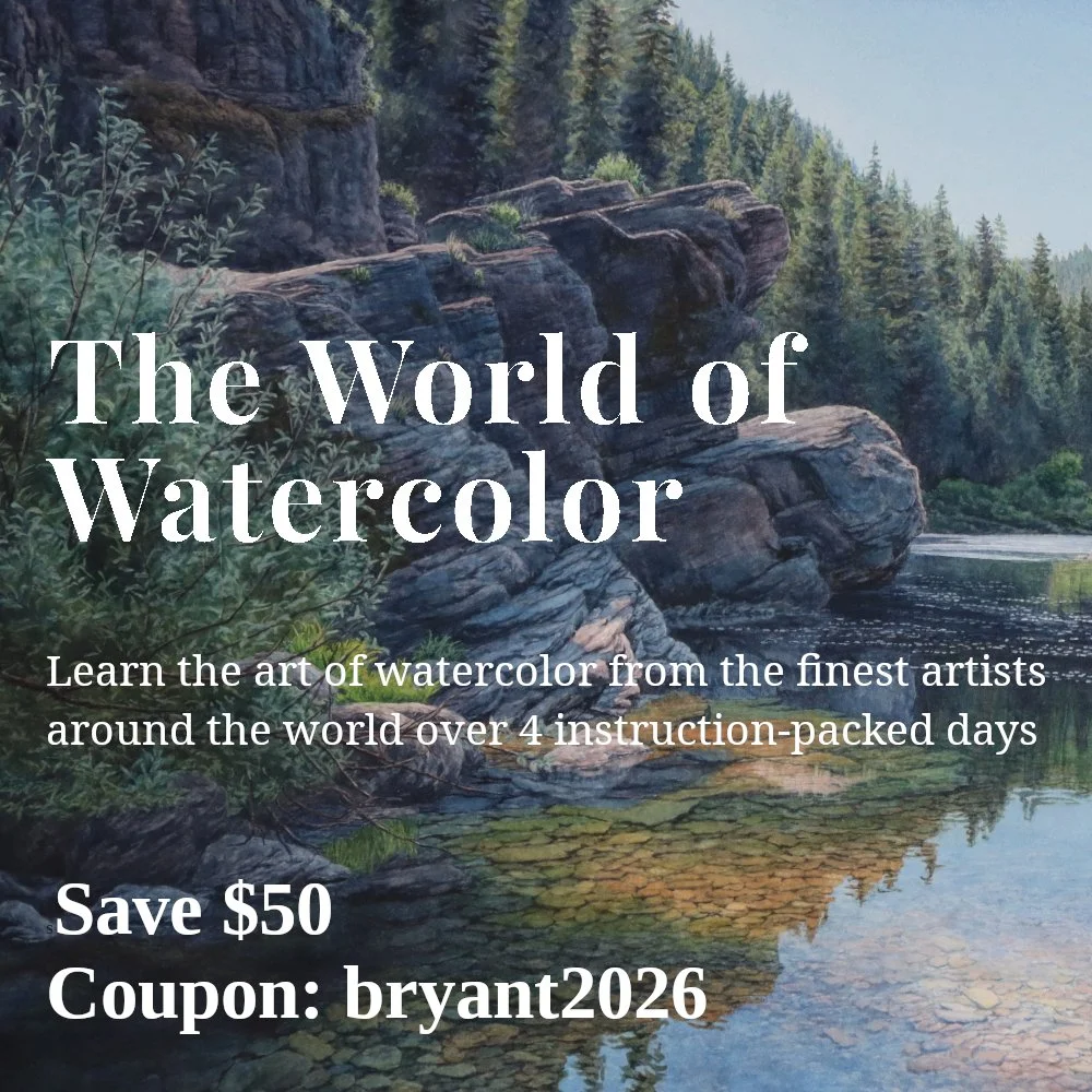 Learn the art of watercolor from the finest artists around the world over four instruction packed days. March 19-22, 2026, online. Save $50 with discount code BRYANT2026.