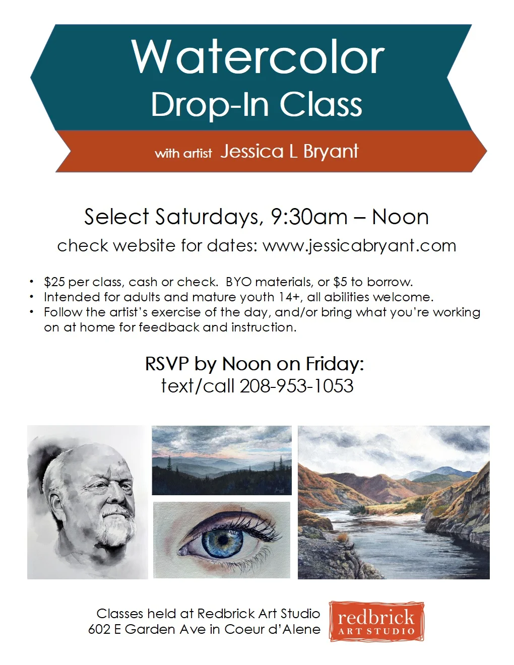 $25, cash or check. Participants may bring their own materials or use Jessica's for an additional $5 fee. Each week Jessica will discuss concepts such as value, composition, controlling water, edge quality, fixing mistakes, and more. Participants are encouraged to bring work in progress from home for input and assistance, and have the option to work independently or follow along on a group assignment.